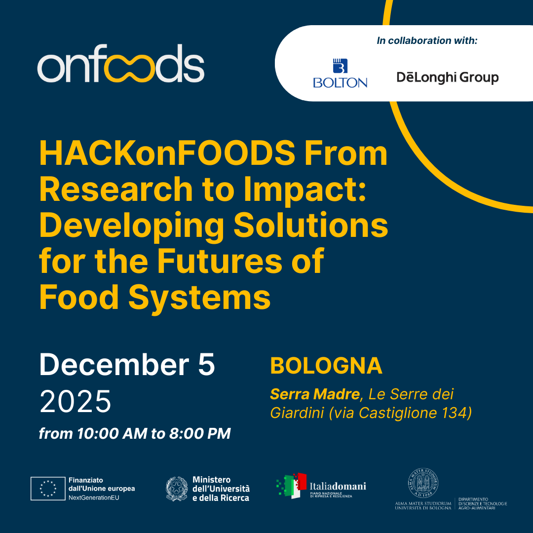 HACKonFOODS – From Research to Impact: Developing Solutions for the Futures of Food Systems is an initiative organized within the PNRR OnFoods project. Young researchers will be gathered in teams which will have a full day to develop ideas to answer to one of the following company-driven challenges: 1) The Future Ingredient Hub: Designing Tomorrow’s Sustainable and Healthy Foods; 2) The Empathic Interface: Making Devices Become Partners in Psyco-Physical Wellbeing; 3) From Waste to Worth: Upcycling Animal Biomass for a Sustainable Food Future.