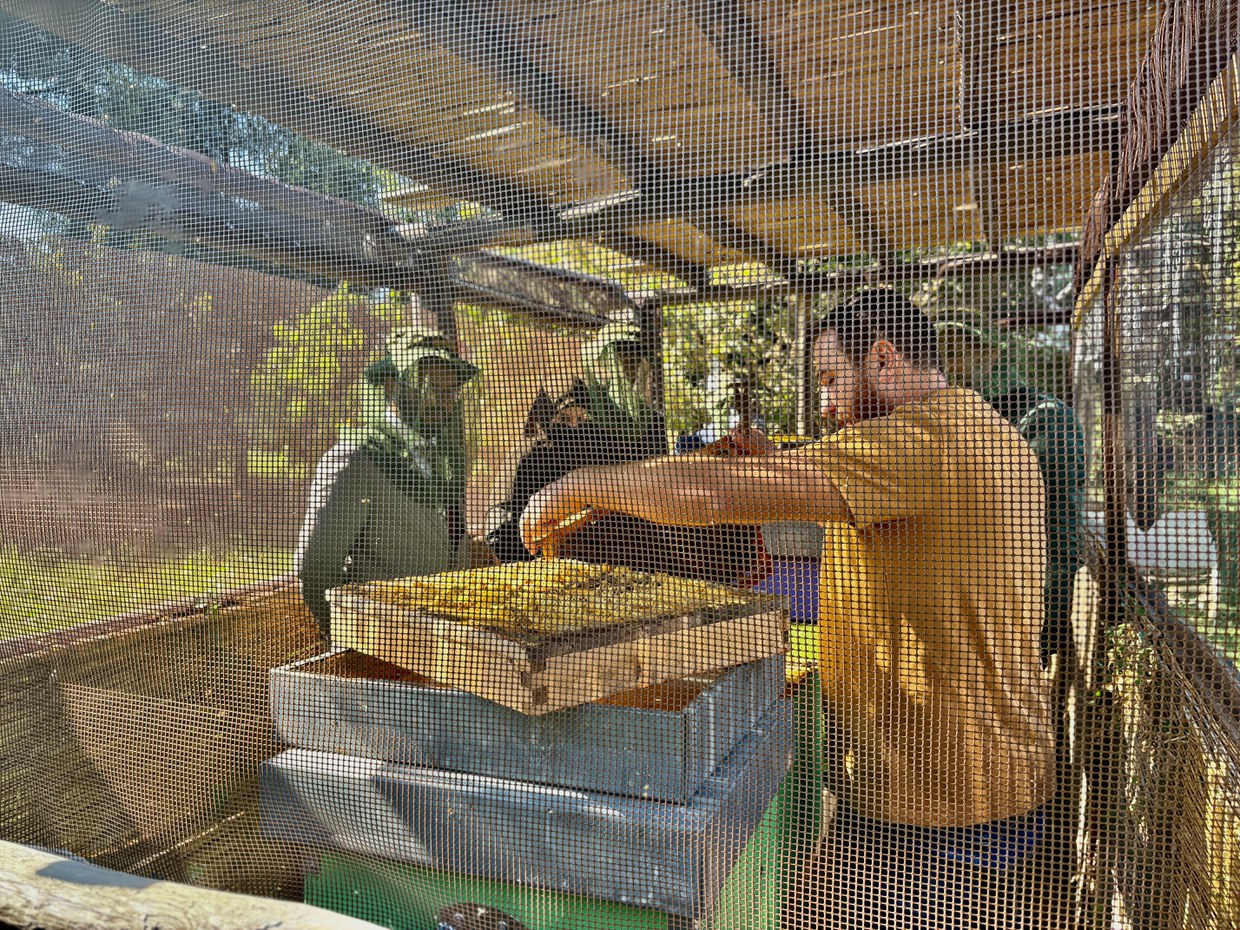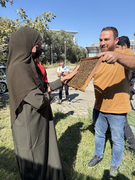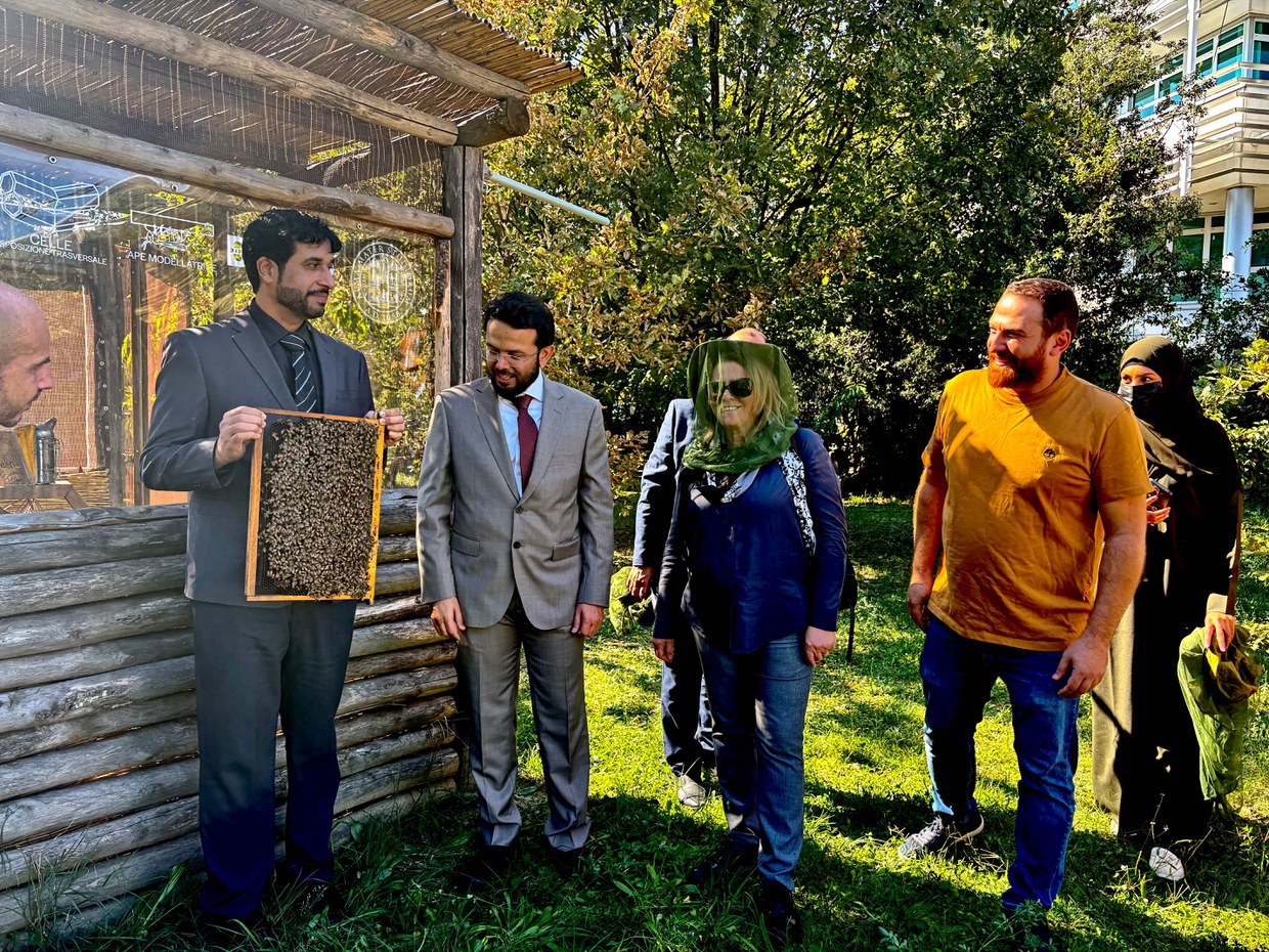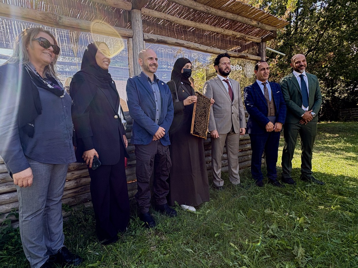 Dopo uno scambio di regali simbolici, la delegazione è stata accompagnata a visitare l’apiario didattico e sperimentale inaugurato la scorsa primavera. Era presente anche Zeid Nabulsi di BeeBo, apicoltore e fondatore dell’azienda agricola Beebo che negli ultimi quindici anni ha ripopolati di api i colli bolognesi. Nabulsi ha supportato a suo tempo il DISTAL nella realizzazione di questo apiario e ha potuto mostrare al gruppo la struttura e le sue api, da vicino. Infine la delegazione è stata omaggiata di alcuni prodotti– dal miele alle saponette – realizzati con il miele del DISTAL.